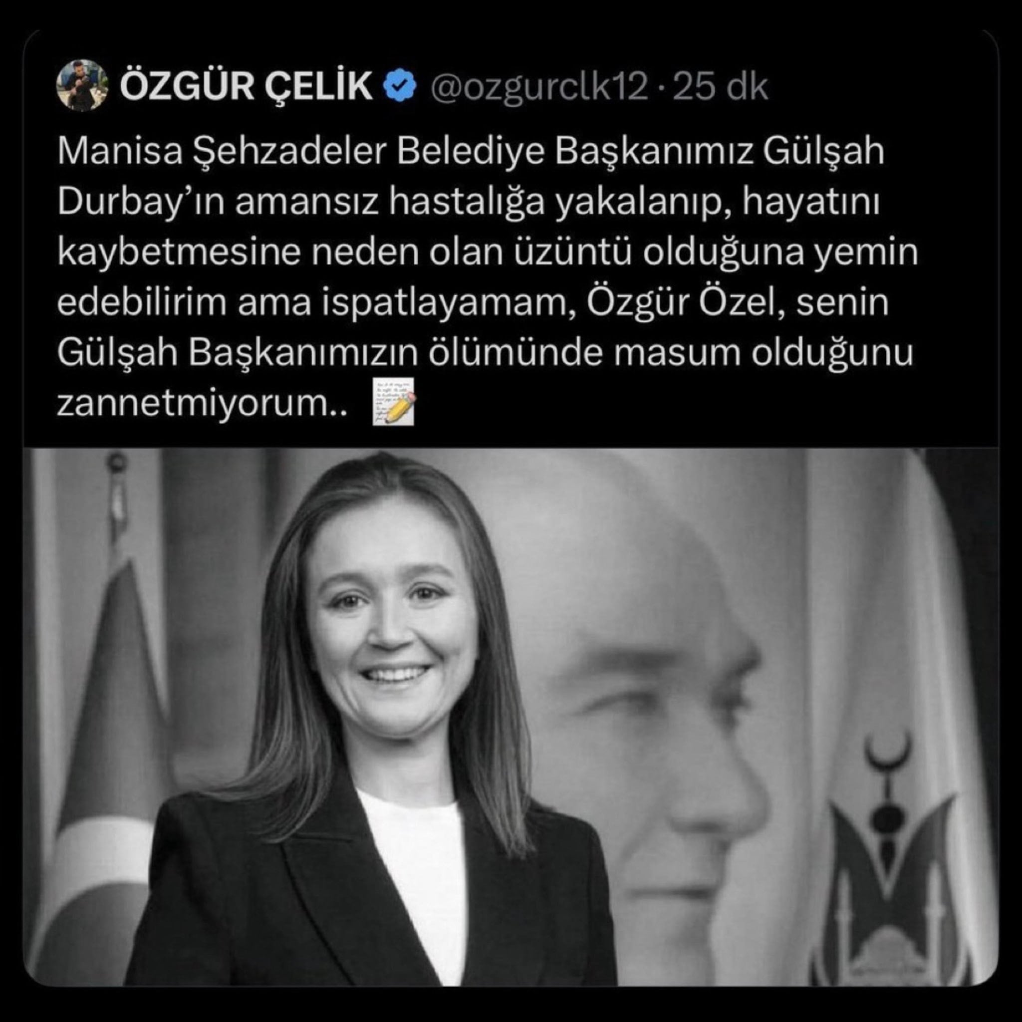Çelik Türkçe hataları ile dolu paylaşımında sosyal medyadan yaptığı paylaşımda, “Manisa Şehzadeler Belediye Başkanımız Gülşah Durbay’ın amansız hastalığa yakalanıp, hayatını kaybetmesine neden olan üzüntü olduğuna yemin edebilirim ama ispatlayamam, Özgür Özel, senin Gülşah Başkanımızın ölümünde masum olduğunu zannetmiyorum” ifadelerini kullandı.