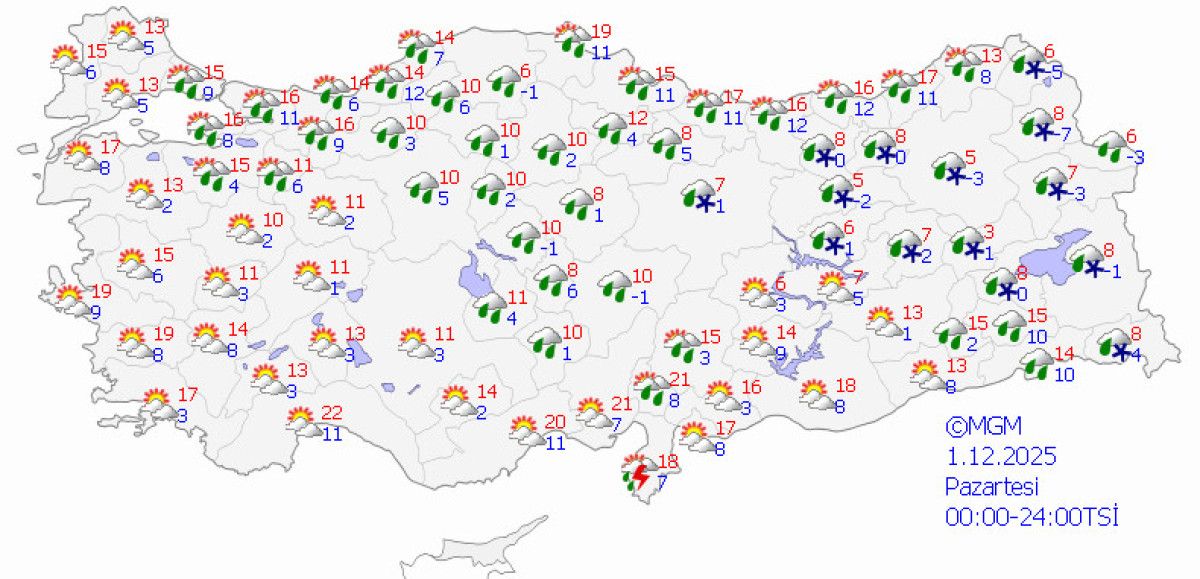 Pazartesi günü yağışlar batı Akdeniz, Mersin, Adana, Hatay kıyıları ile Afyonkarahisar’da yerel kuvvetli olacak şekilde devam edecek.